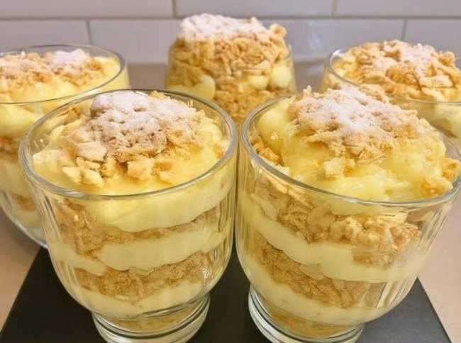 - Asamblează desertul în pahare: În pahare transparente (pentru un efect frumos), pune un strat de cremă de vanilie pe fund. Adaugă un strat generos de biscuiți sfărâmați. Alternează straturi: cremă – biscuiți – cremă – biscuiți (2-3 straturi totale, în funcție de mărimea paharelor). Dacă vrei biscuiții mai moi, înmoaie-i rapid în puțin lapte înainte de a-i pune. Terminând cu un strat de cremă, presară deasupra biscuiți sfărâmați și zahăr pudră pentru decor.